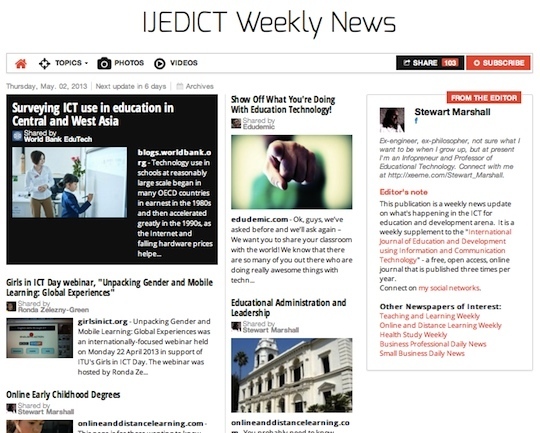 "IJEDICT Weekly News", by Stewart Marshall: an online newspaper with a curated selection of articles, blog posts, videos and photos about ICT for education and development.